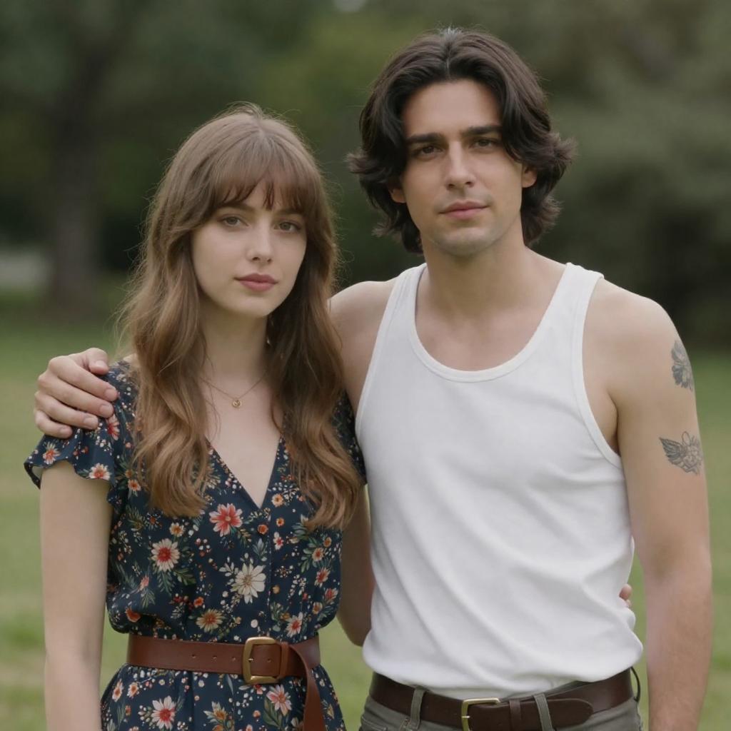 Photograph of a man and woman standing close together. The man, with medium-length dark hair, wears a white tank top and has a tattoo on his left arm. The woman, with light brown hair and bangs, wears a floral dress with a brown belt. She has her right arm around his shoulders. They are outdoors with a blurred greenery background.