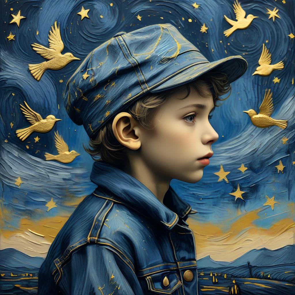 In the style of Vincent van Gogh, Charcoal lines sketch, a surrealist textured portrait of a young boy with a starry night hat that blends into swirling skies. Birds perch against a deep blue background with splashes of gold paint. Porcelain complexion, neutral expression, wearing a denim jacket.