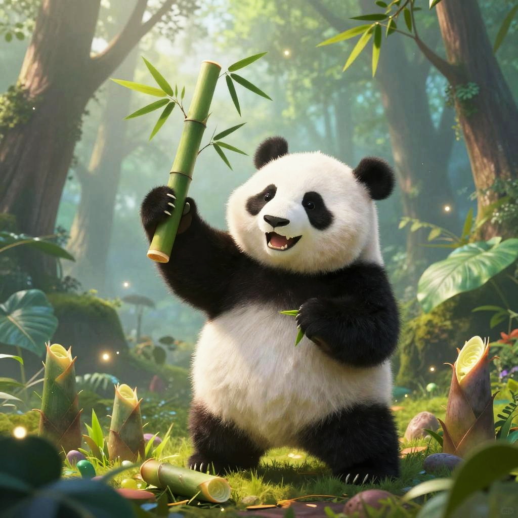 Cute CGI panda with black ears, paws, and face markings, sitting on grass in a sunlit bamboo forest, smiling.