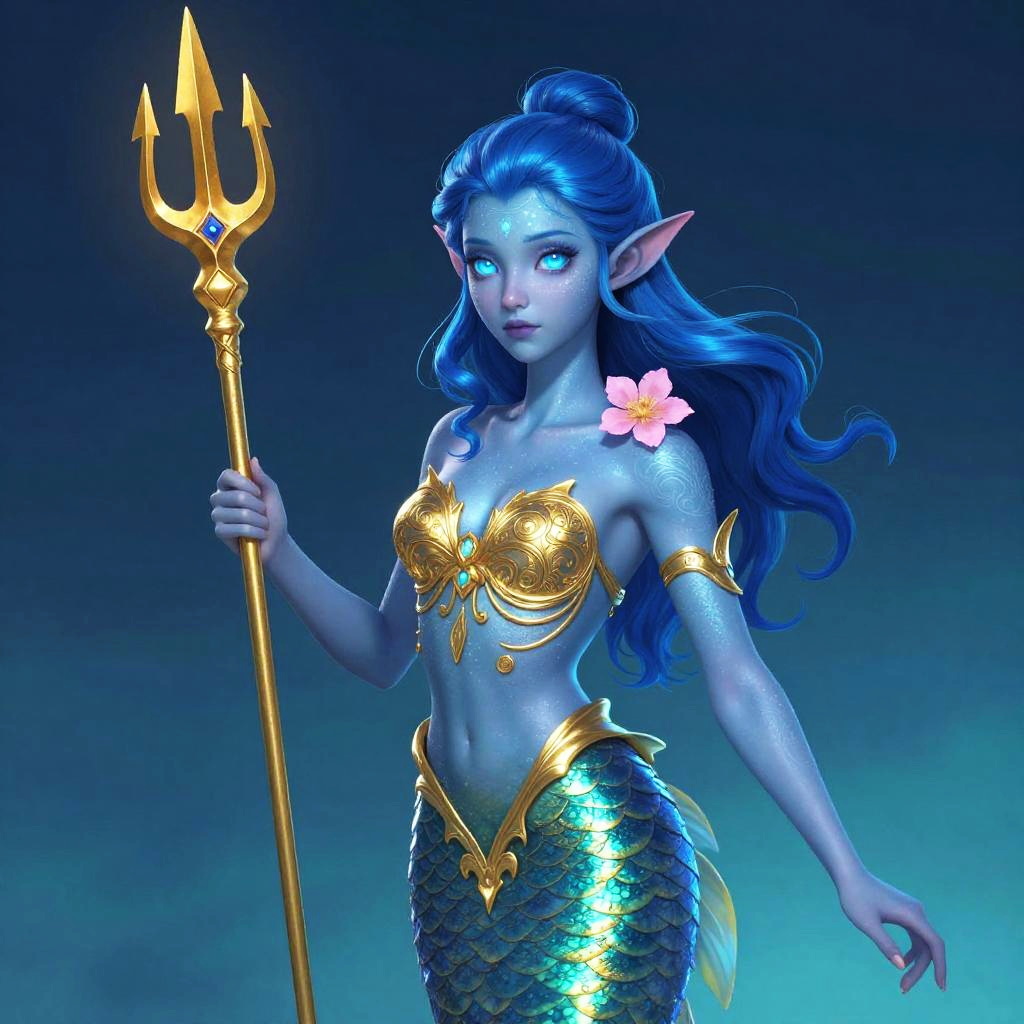 Digital artwork of a blue-skinned mermaid-like sea goddess with fin-like ears, holding a golden trident. She has glowing blue eyes, intricate gold patterns on her body, and a small pink flower on her left shoulder. Her hair is styled in a blue updo, and she's wearing a form-fitting gold and blue body suit. The background is a gradient of dark blue and teal, adding a mystical oceanic vibe.