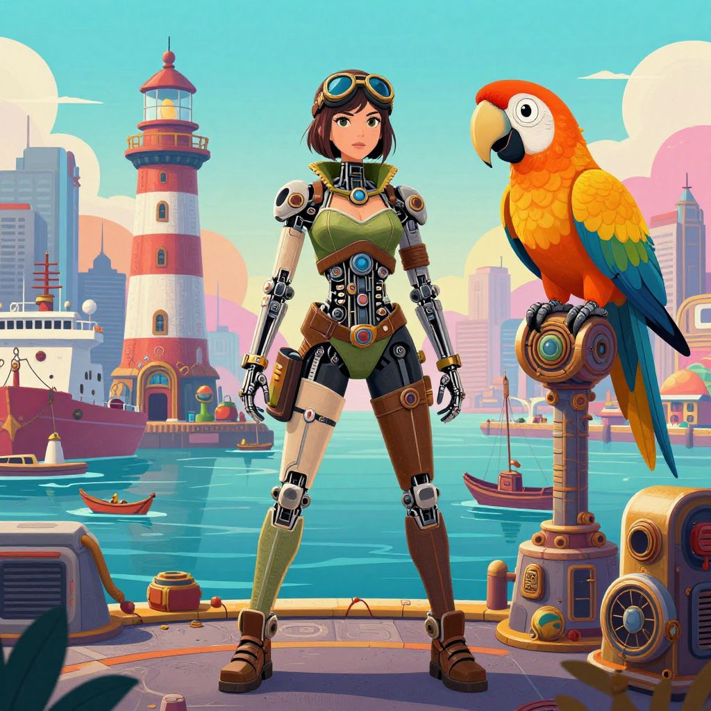 In this vibrant and dynamic scene, a futuristic seaport city unfolds with a striking mix of steampunk and cyberpunk elements. A woman, adorned in a revealing, mechanical outfit with exposed mechanical bones and hydraulic ligaments, stands confidently in the foreground. Her attire is a blend of green and brown, accented with intricate details and a pair of goggles that add to her adventurous persona. To her right, a robot parrot, with an orange and white plumage and a large, sharp beak, perches on a structure, seemingly observing its surroundings. The background reveals a bustling harbor with ships and a towering lighthouse, bathed in a technicolor spectrum that enhances the surreal atmosphere. The overall composition is symmetrical, with the woman and the parrot positioned centrally, creating a balanced and harmonious visual narrative. The intricate outlines and detailed textures of the characters and the environment contribute to a sense of depth and realism, making this image a breathtaking representation of a futuristic world.