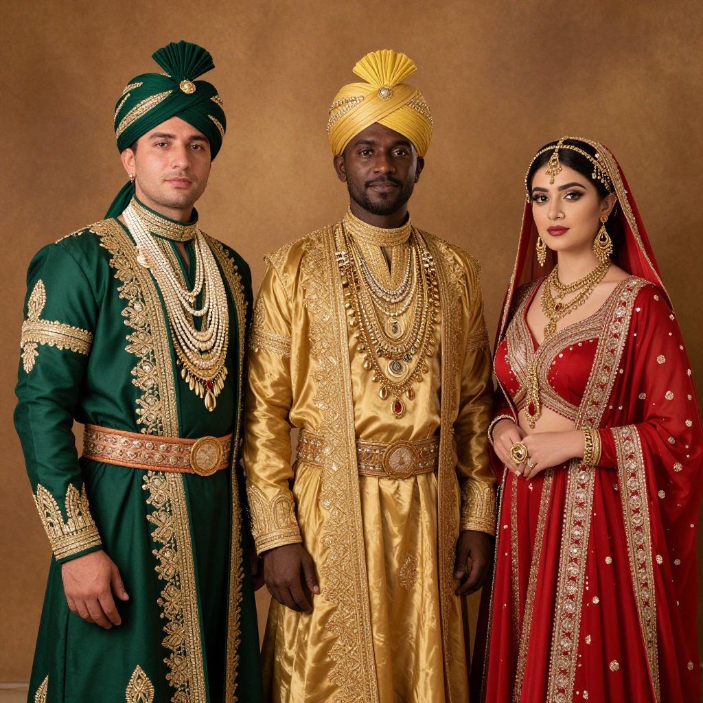 Richly adorned figures stand together, showcasing vibrant traditional attire: a man in green with intricate jewelry and a turban, another in gold with elaborate necklaces and a matching robe, and a woman in red with ornate accessories and a deep neckline, all set against a warm, textured background.
