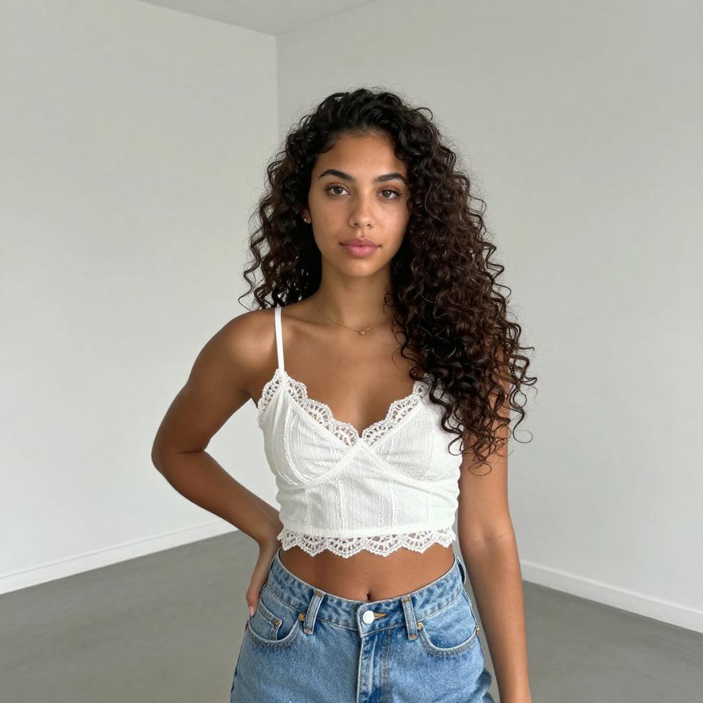 Photograph of a young woman with long, curly black hair, light brown skin, and brown eyes. She wears a white lace-trimmed crop top and high-waisted light blue jeans. She stands in a modern, white-walled room with gray flooring, looking directly at the camera with a neutral expression. Her right hand rests on her hip.