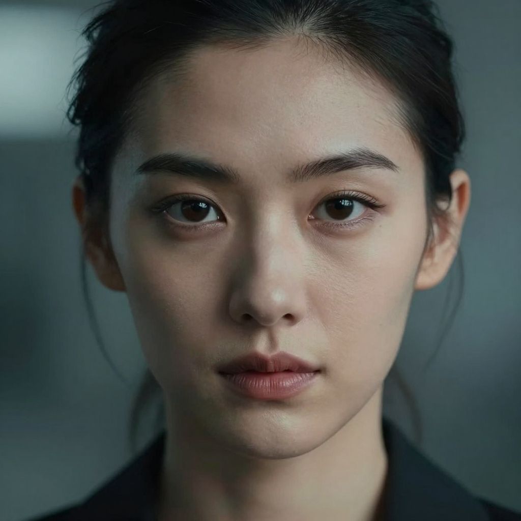 Photograph of an East Asian woman with fair skin and dark brown hair pulled back, facing forward. She has almond-shaped brown eyes, thin eyebrows, and slightly parted lips with a neutral expression. Her face is smooth with minimal makeup, highlighting her natural features. She wears a dark, simple top. The background is blurred with cool tones, focusing attention on her face. The lighting is soft, creating a slight glow on her skin. The overall style is realistic and minimalistic, emphasizing her natural beauty and calm demeanor.