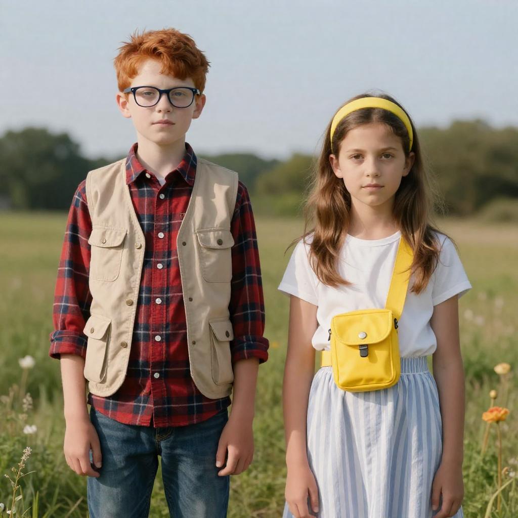 Multiple boys, bag, denim, hoodie, hood, pants, yellow hoodie, jeans, blue pants, backpack, headphones, black hair, headphones around neck, jacket, holding, blue jacket, closed eyes, 1girl, glasses, shirt, long hair, traditional media, smile, hood down, white shirt