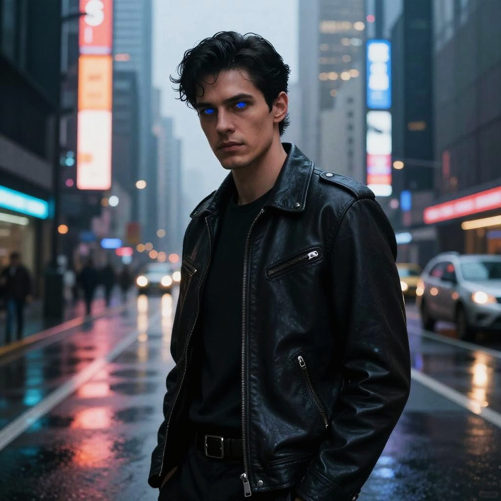 Black hair blue eyes man standing in a futuristic cityscape at dusk, neon lights reflecting off wet streets, wearing a sleek leather jacket, cinematic lighting, dramatic atmosphere