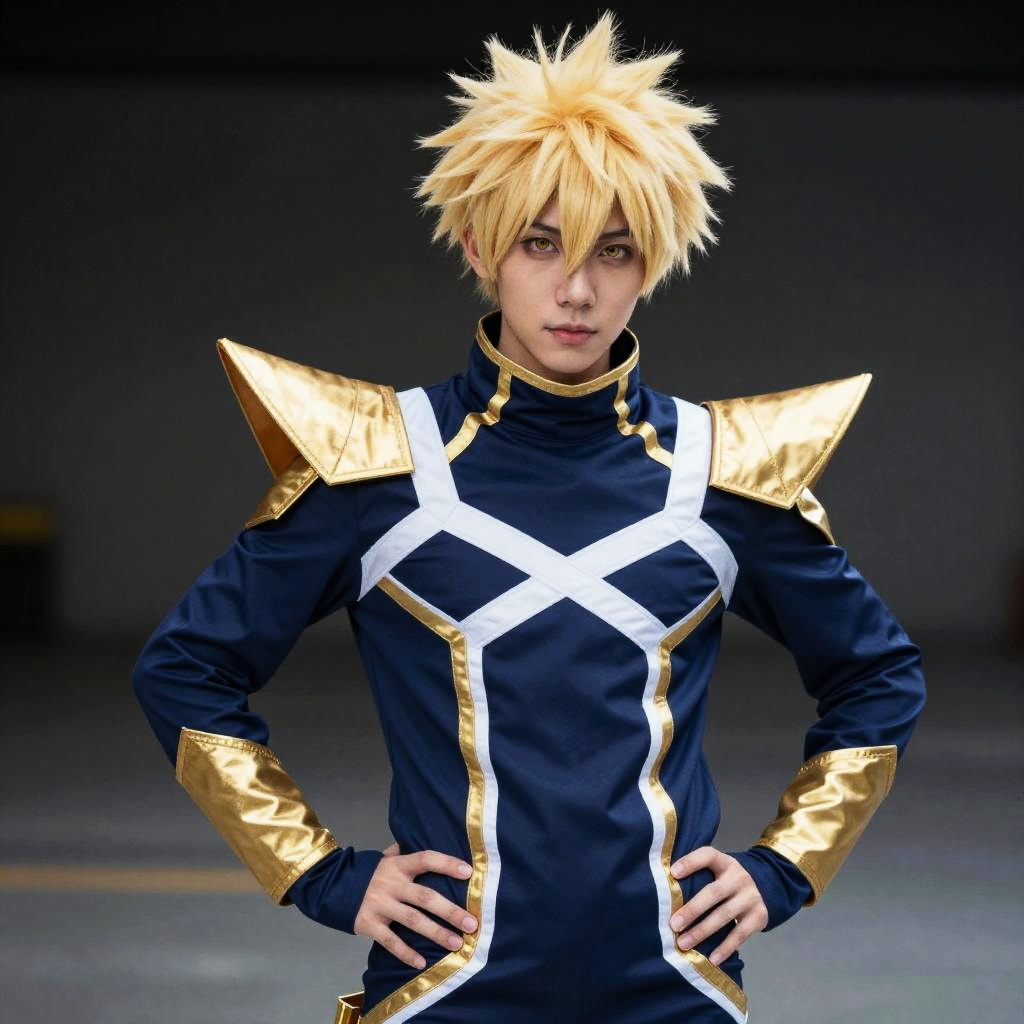 Photorealistic CGI of a young man cosplaying Naruto, with spiky blonde hair, blue and gold armor, white cross design, hands on hips