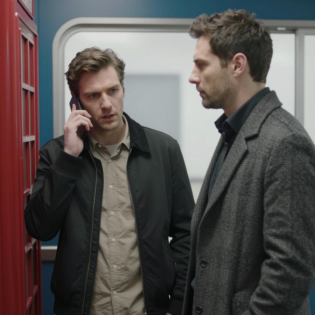 Photograph of a man in a dark suit, red shirt, standing in a public payphone booth, holding a phone to his ear. The booth is next to a gyro shop with glass windows. Neon lights and posters in the background. Man's expression is focused. Indoor setting with fluorescent lighting. Another person in the background, partially visible.