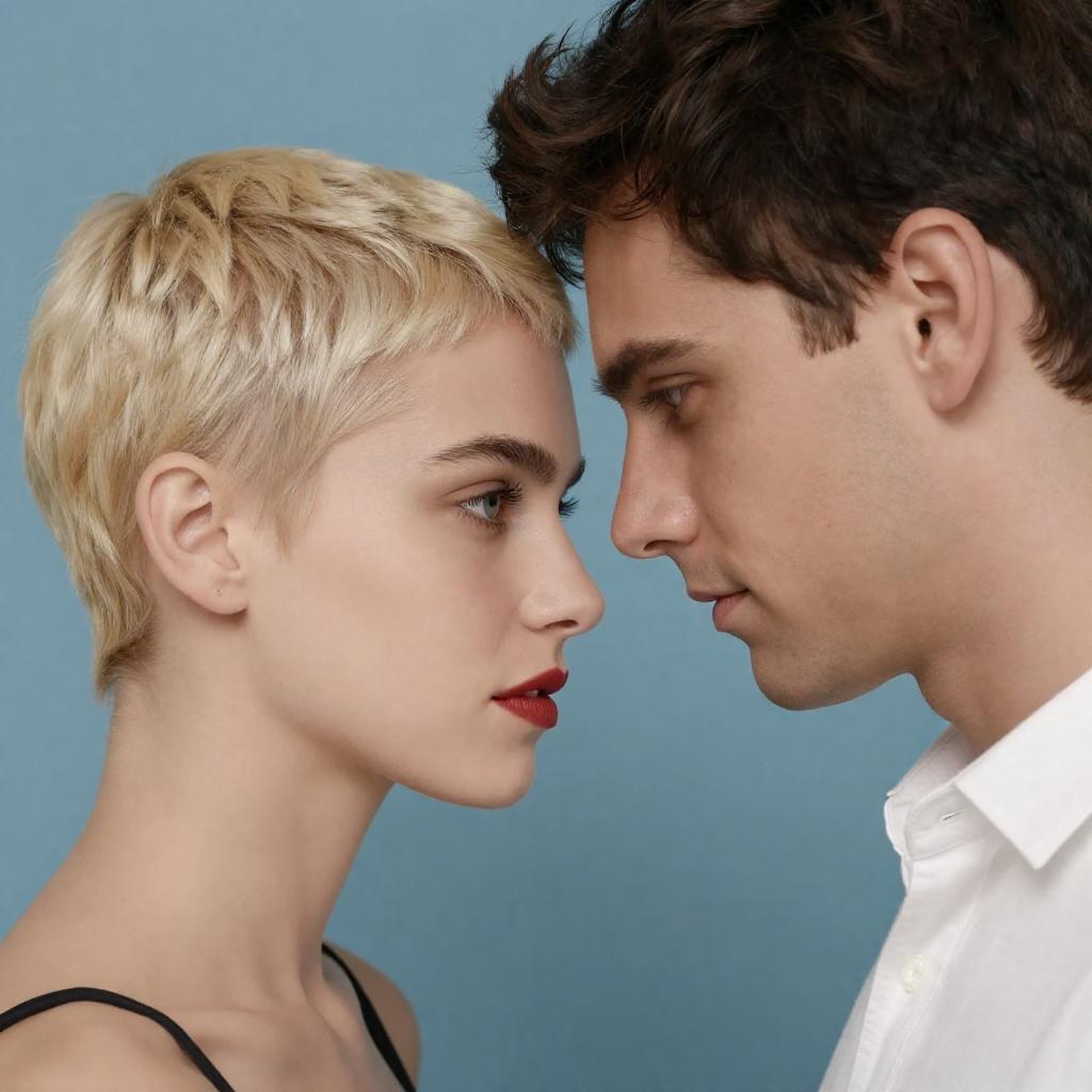 Photograph of a man and woman with close-cropped blonde and dark brown hair respectively, against a blue background. Woman has light skin, blue eyes, red lipstick, looking slightly to the side. Man has light skin, brown eyes, white shirt, looking down at her. Their foreheads touch.