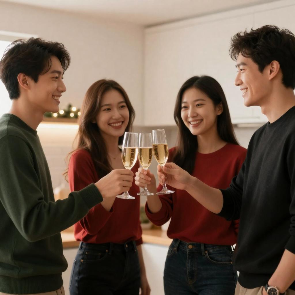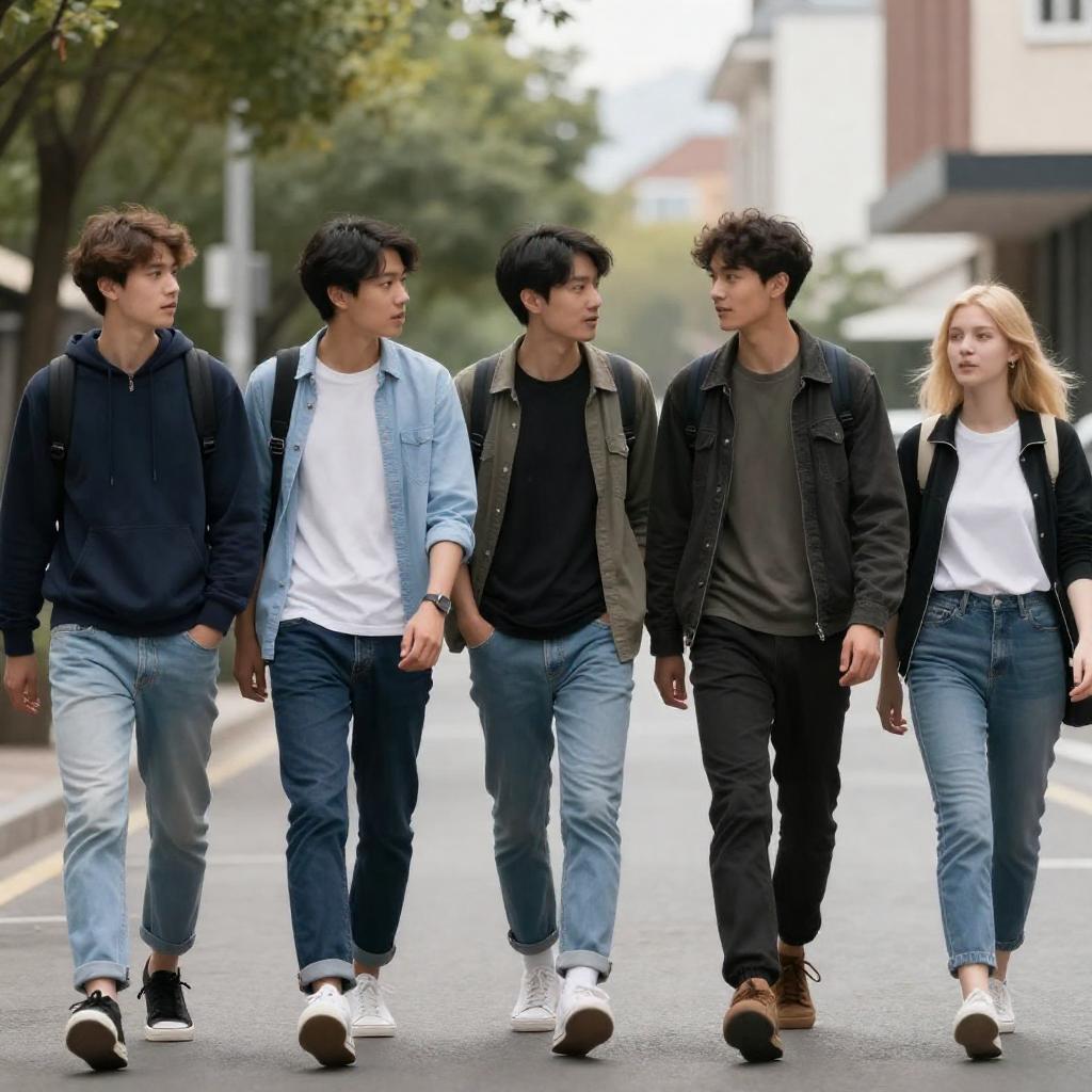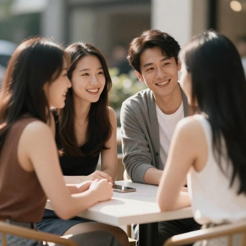 Photograph of three young adults, two men and one woman, laughing at a wooden outdoor table. They wear black clothing, with the men having dark hair and the woman having brown hair. Condiment bottles and waffle cones are on the table. Brightly lit, colorful background with blurred lights and flags.