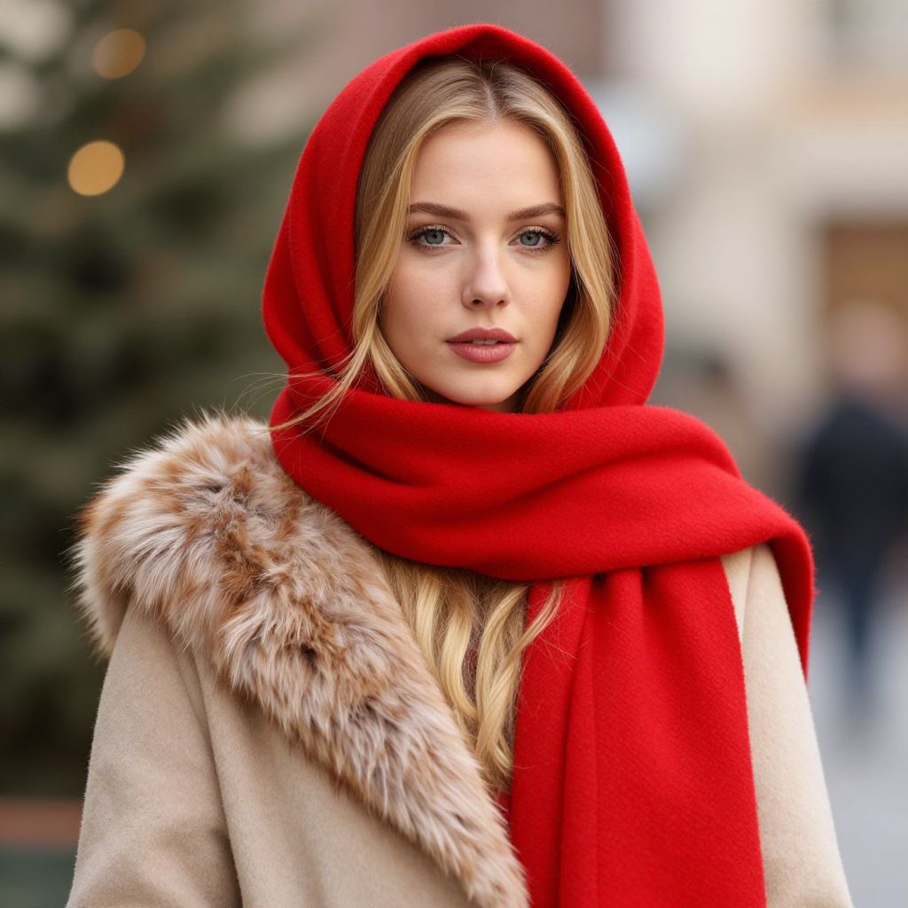 Christmas outfit elegant, 1girl, solo, long hair, red scarf, hood, realistic, blonde hair, looking at viewer, scarf, blue eyes, fur trim, christmas, lips, coat, blurry, blurry background