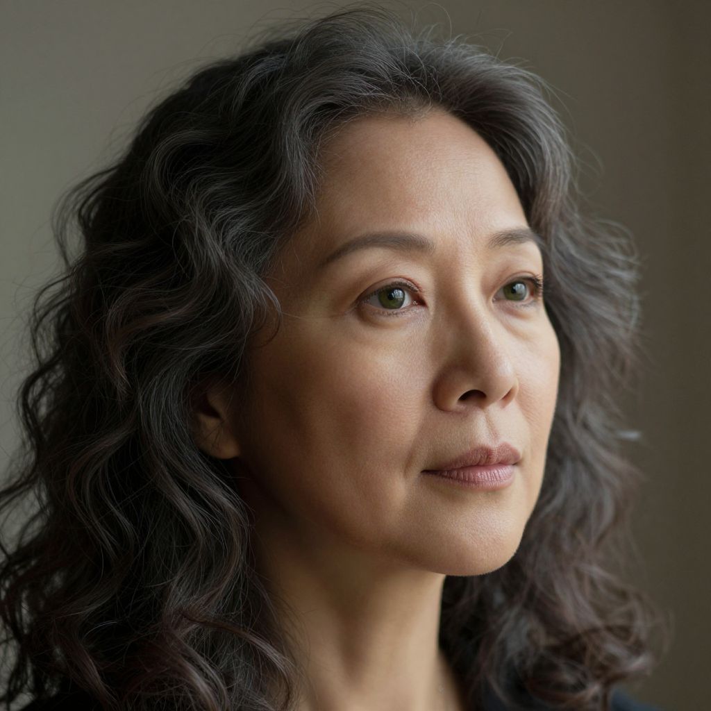 Hyperrealistically portray a middle-aged East Asian woman with warm skin and curly, salt-and-pepper hair. Her minimal makeup showcases her age-defying complexion and deep green eyes. As she gazes off contemplatively, her expression shifts between serenity and introspection. The shallow depth of field and soft, dramatic side lighting cast gentle shadows across her features and texture. A slightly blurred background draws the viewer into her quiet reflection.