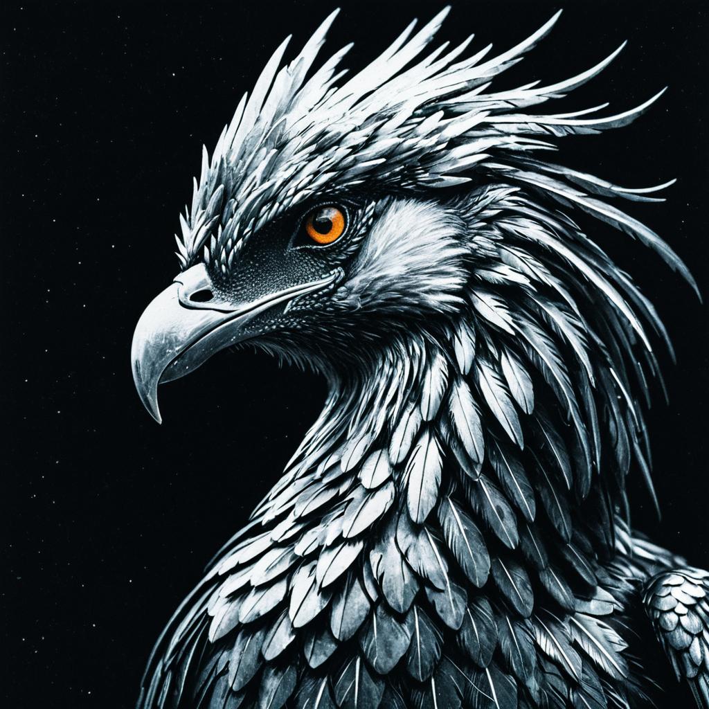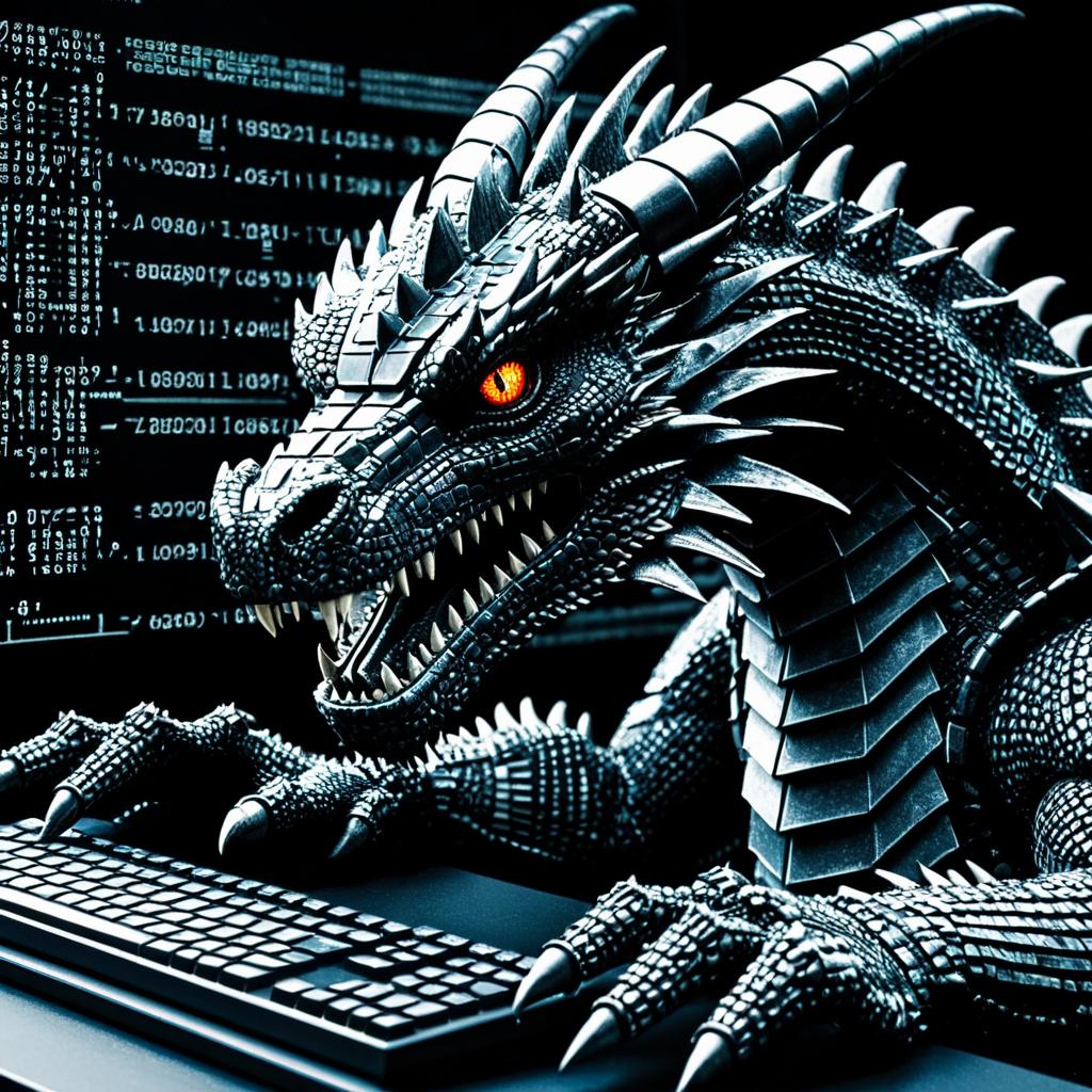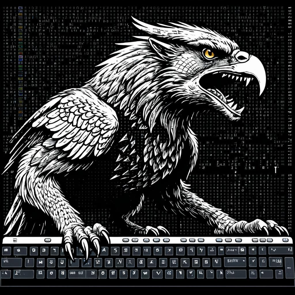 Aggressive griffin depicted in ASCII art style, composed of brackets, slashes, and keyboard symbols, with scrolling code and hexadecimal digits in the background, created using text editor, determined expression