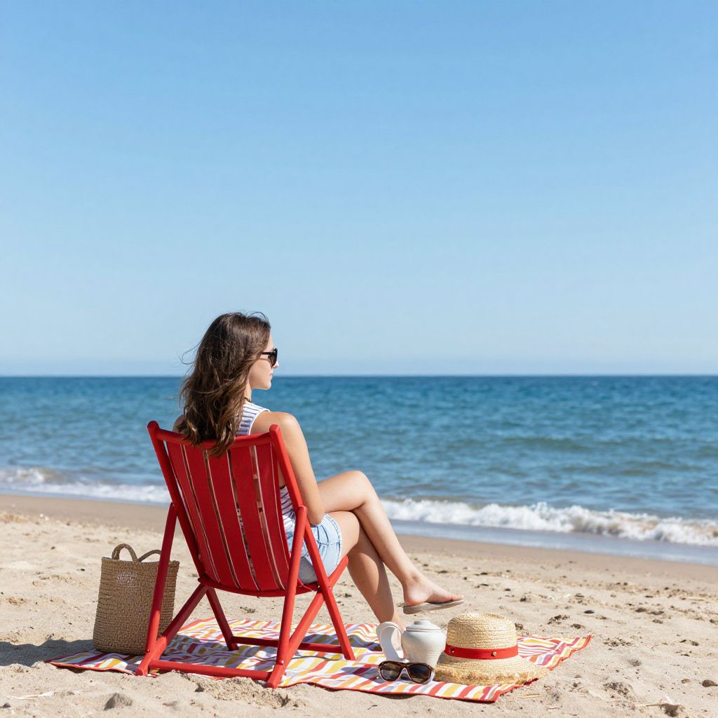 Woman picnicking and overlooking the sea sitting on a red chair at the beach stock photos