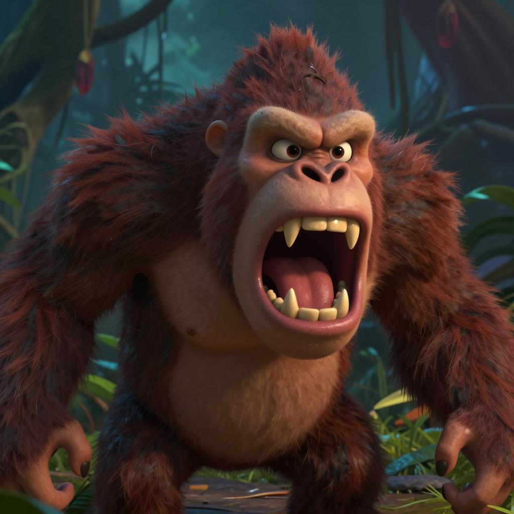 Retro Aesthetics an angry roaring sasquatch monster with open mouth sharp teeth and covered in long dirty fur gorilla pose cartoon in the style of dreamworks abominable, looking sideways, big cartoon eyes, fangs, spooky lighting, nighttime jungle in the background, screengrab, cinematic lighting, 4k clean 8k smooth sharp focus, directed by pixar,