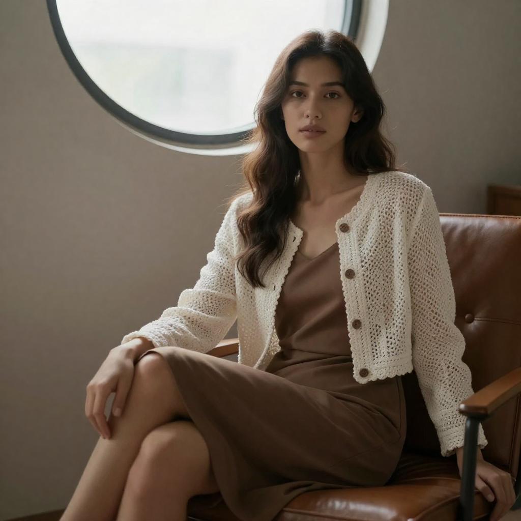 Woman with long brown hair, wearing a white crocheted jacket over a brown dress, sitting on a leather chair. Circular window in the background. Dim lighting. Soft shadows. Right-hand resting on lap. Neutral facial expression. Sparsely decorated room.