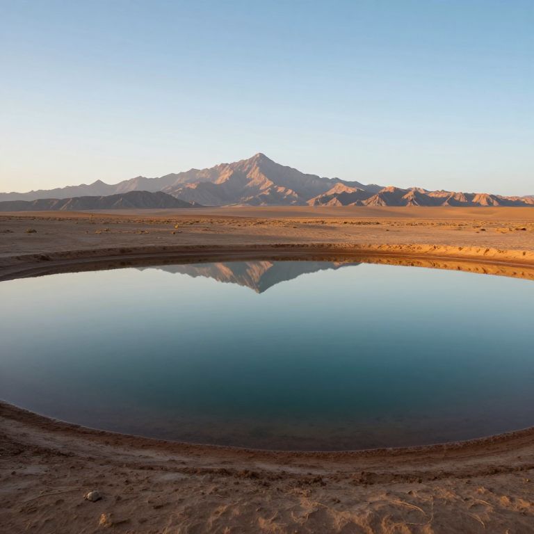 Photograph of a serene desert landscape at sunset. A circular, still water pool reflects a distant mountain range under a clear, blue sky. The mountain, bathed in warm orange and pink light, stands prominently in the background. The barren, rocky desert floor surrounds the pool, with subtle textures of sand and small rocks. The water's surface is mirror-like, creating a symmetrical reflection of the mountain. The overall composition highlights the contrast between the calm water and the rugged desert terrain, with the soft, glowing light adding a tranquil, almost magical atmosphere to the scene.