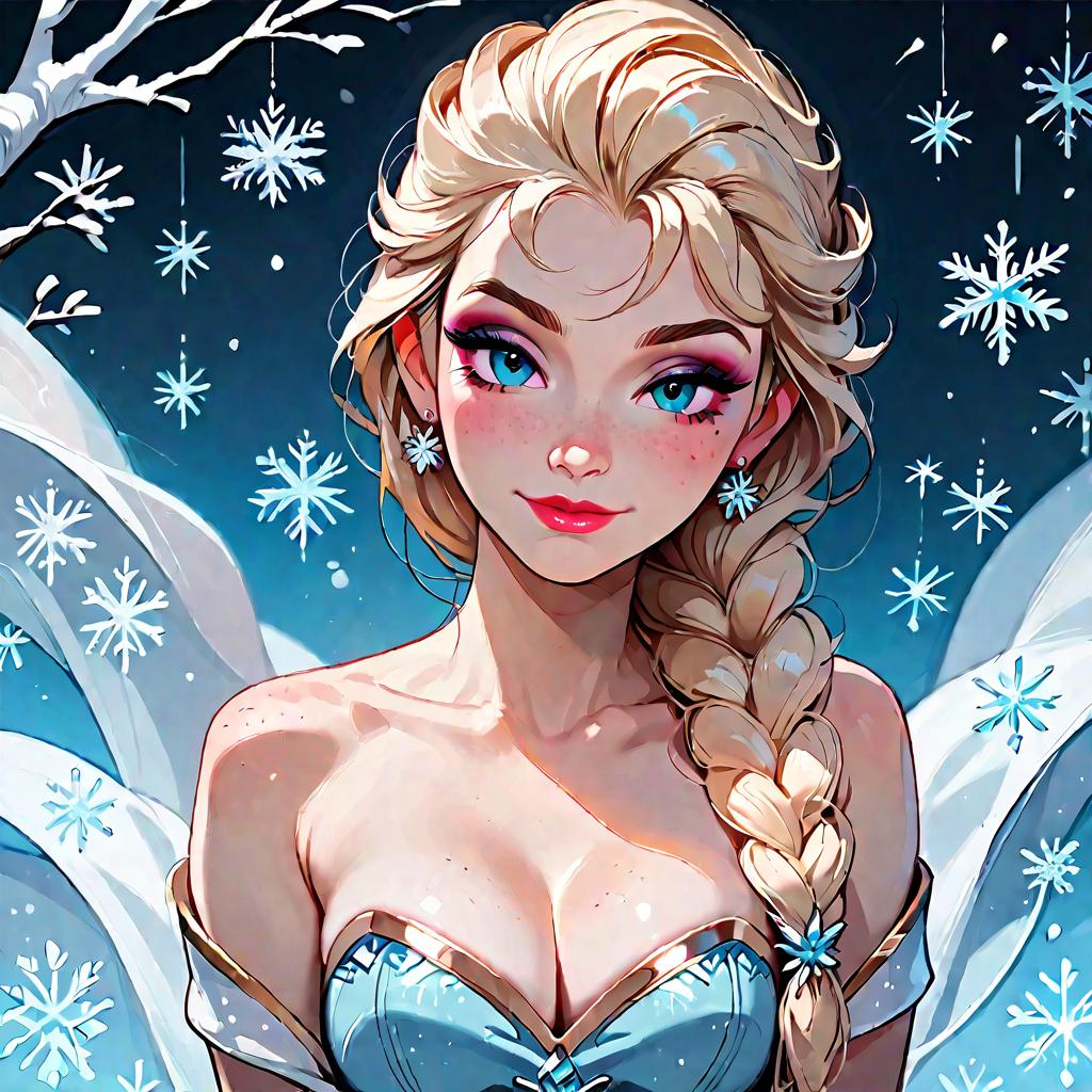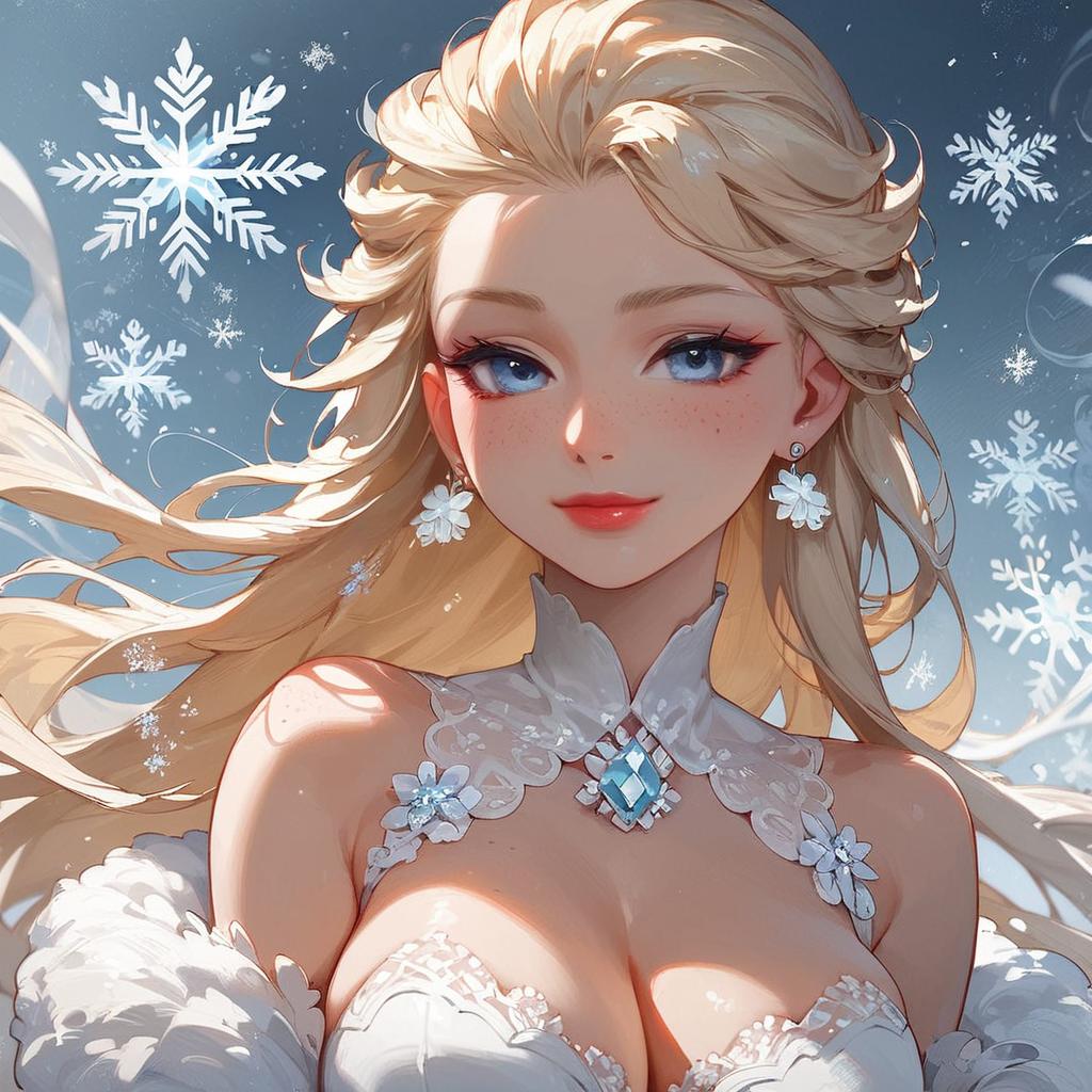 Masterpiece, best quality, highly detailed, score_9, score_8_up, score_7_up, score_6_up, source_Anime, 1girl, elsa (frozen), solo, blue eyes, blonde hair, long hair, dress, makeup, freckles, smile, lipstick, bare shoulders, snowflakes, white dress, large breasts, half body, sitting