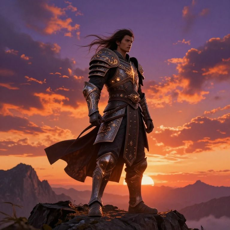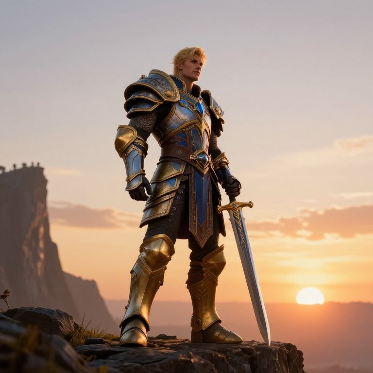 Wide-Angle Artistic Expression a young blond king, golden and blue armor, looks like Anduin Wrynn, World of Warcraft, standing on a cliff at sunrise, hand on the hilt of his sword,
