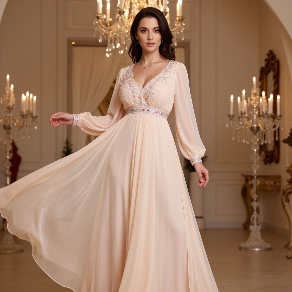 A elegant woman with almond eyes and a graceful posture wearing a flowing georgette party wear dress in soft peach tones with embroidery, posing in a candlelit mansion hall with soft lighting and crystal decorations, creating a romantic and sophisticated costume atmosphere.. The woman has big breasts and cute face