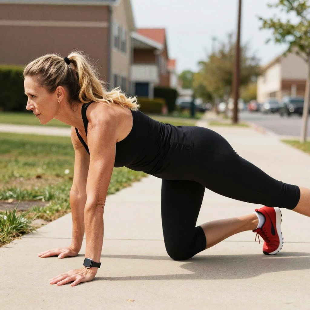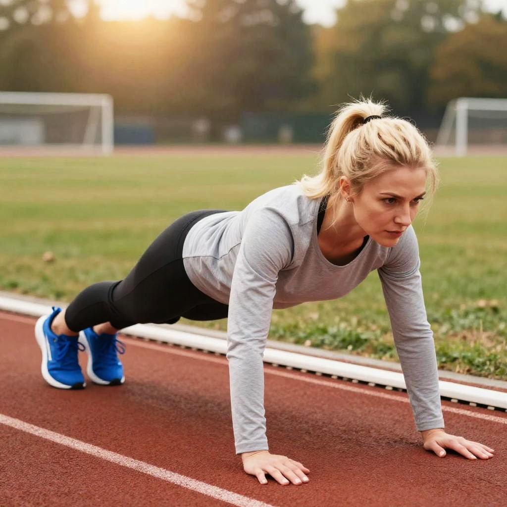 A high-contrast photograph of a blonde woman with a fit, muscular build, doing a plank exercise on a pink yoga mat outdoors. She's wearing a pink sports bra, black leggings, and pink sneakers. Her hair is tied back in a bun. The background shows a blurry, sunlit park with green trees and a fence. The pavement is dark gray, and the image has a bright, almost surreal quality.