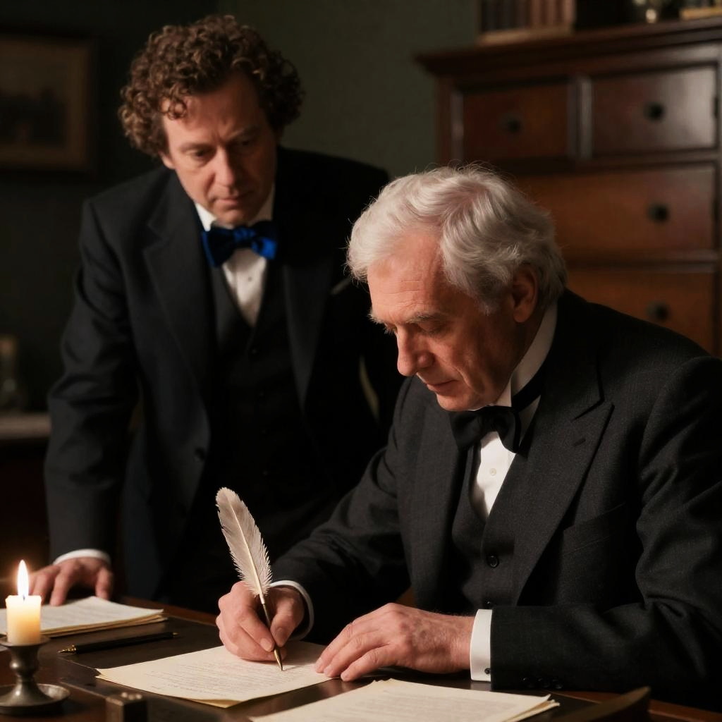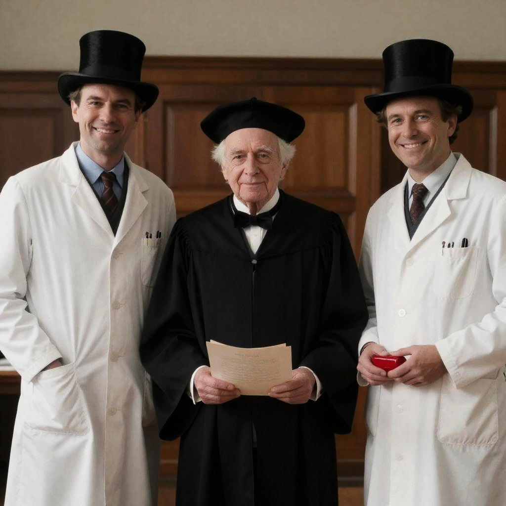 Photograph of a film scene. Three men in white lab coats and black top hats stand in a room. Central figure is an elderly man with white hair, black cap, and academic gown. Two men on left and right, both smiling. Background has wooden furniture. Central figure holds papers. Man on right holds a red object.