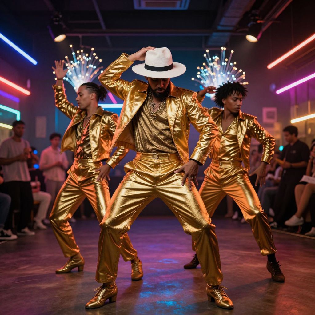 The image depicts a vibrant and dynamic scene featuring three dancers in a soulful pose, exuding energy and passion. The central figure, a man in a stylish white hat and gold jacket, stands out prominently, flanked by two other dancers in striking, metallic gold outfits. The background is a mesmerizing blend of neon lights and dynamic motion blur, creating an immersive and cinematic atmosphere. The lighting is dramatic, with a mix of incandescent and optical fiber effects, casting a warm, moody glow over the scene. The composition is meticulously crafted, with the dancers positioned in a way that draws the viewer's eye through the image, from the left to the right. The overall effect is one of intense energy and movement, enhanced by the hyper-detailed and intricately color-coded elements, making it a visually stunning and captivating piece of art.
