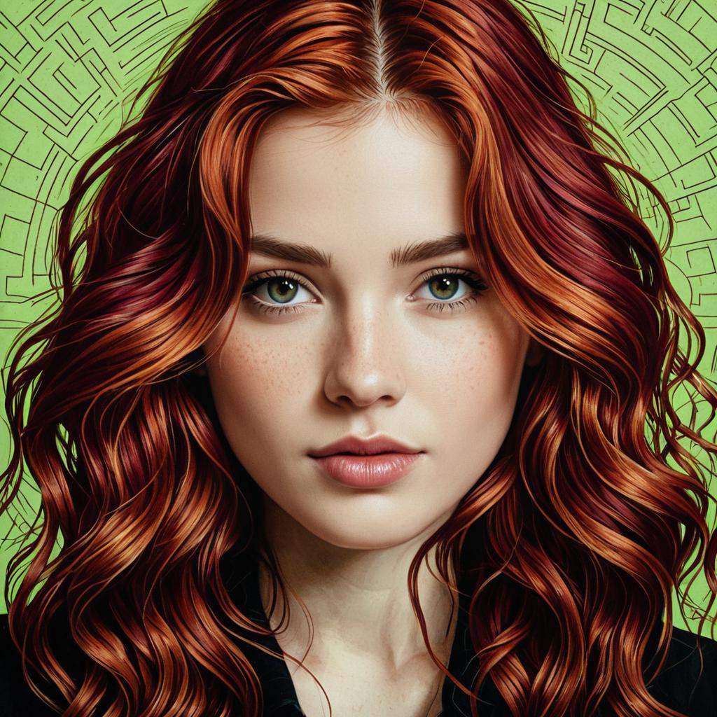 A high-resolution, vibrant watercolor portrait of a beautiful Scandinavian woman with striking blue eyes and long flowing auburn hair. Inspired by Alphonse Mucha's style, the image features intricate patterns and rich colors reminiscent of Art Nouveau designs, emphasizing elegance and natural beauty.