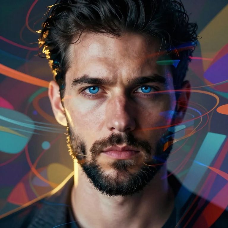 Photorealistic digital portrait of a handsome man with blue eyes, dark hair, and beard, set against a vibrant, abstract colorful background with glowing lines