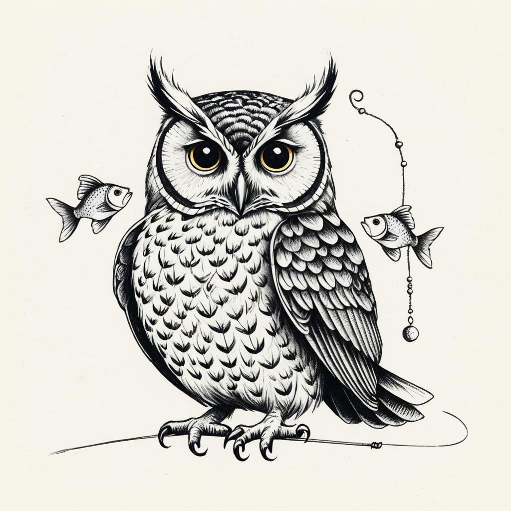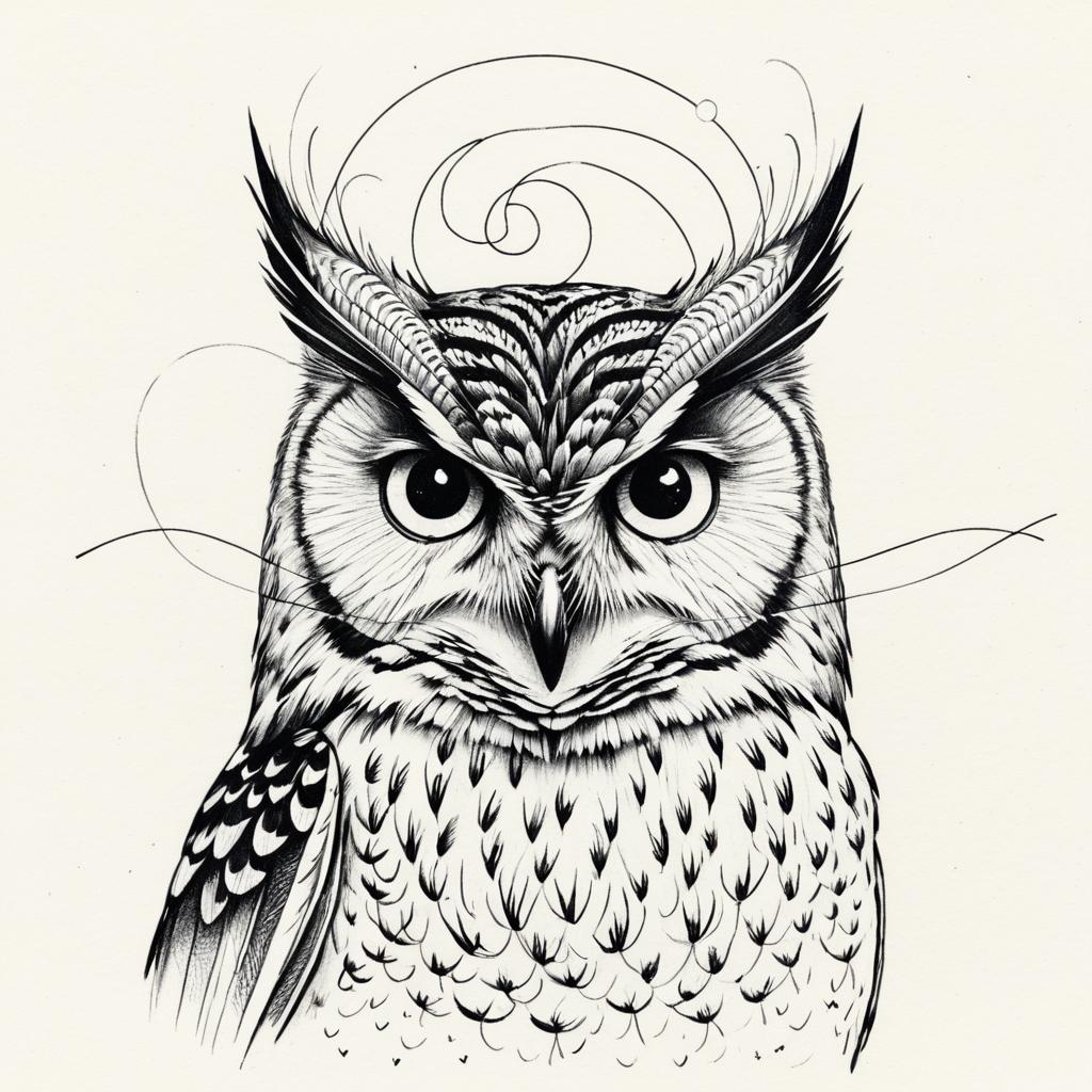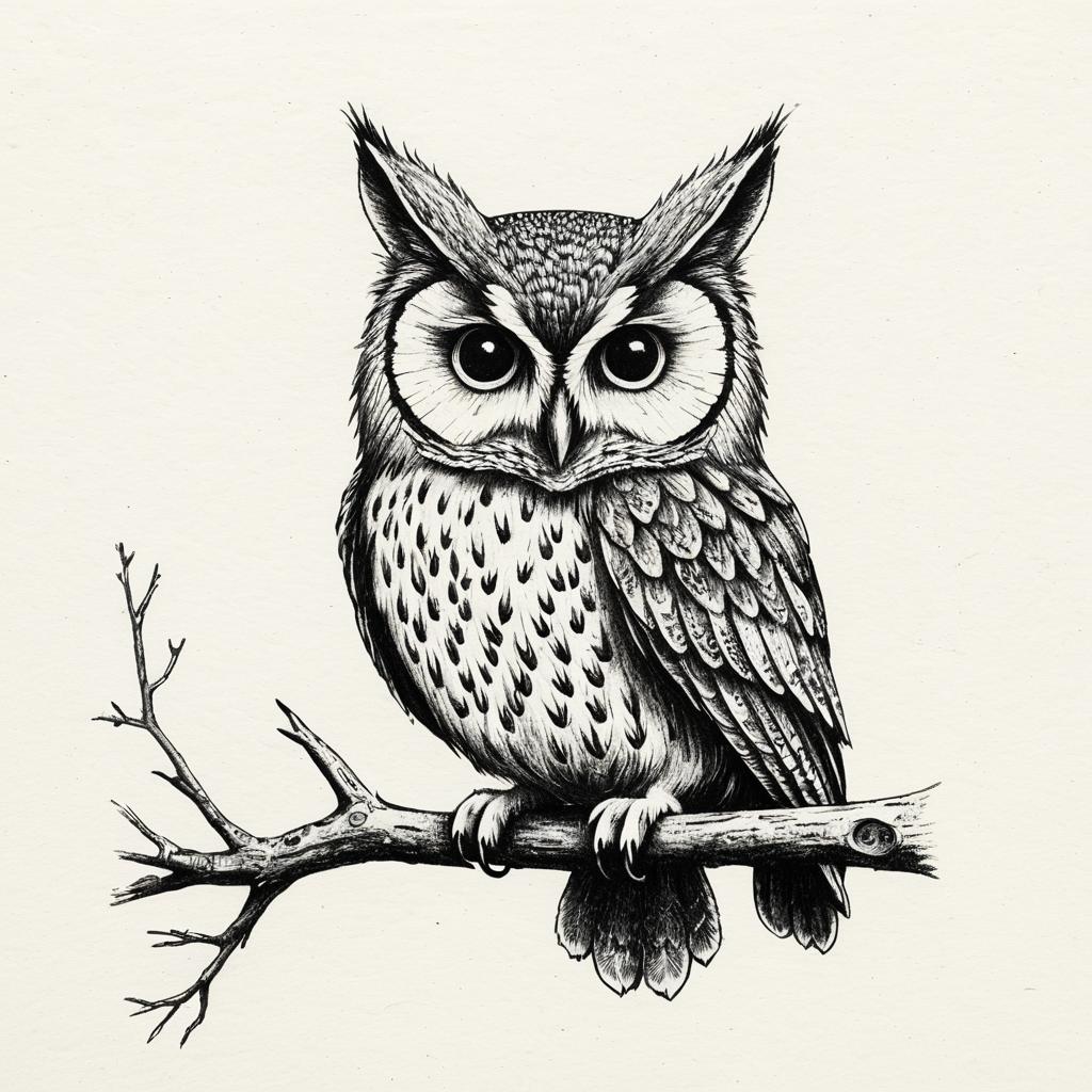 Black and white pencil sketch illustrating a detailed owl perched on a bare tree branch. The owl features prominent large eyes, textured feathers, and an expressive face rendered with intricate hatching lines. The minimalist drawing emphasizes rustic and playful design elements against a white background.