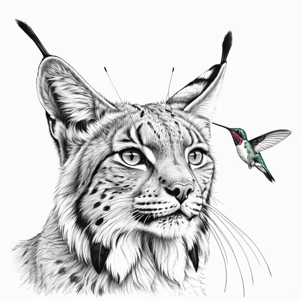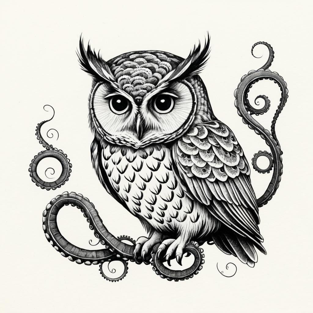 A whimsical pencil sketch of a owl with hollow tree body and fox tail, in a rustic and textured hatching lines, minimalist and playful design, white background