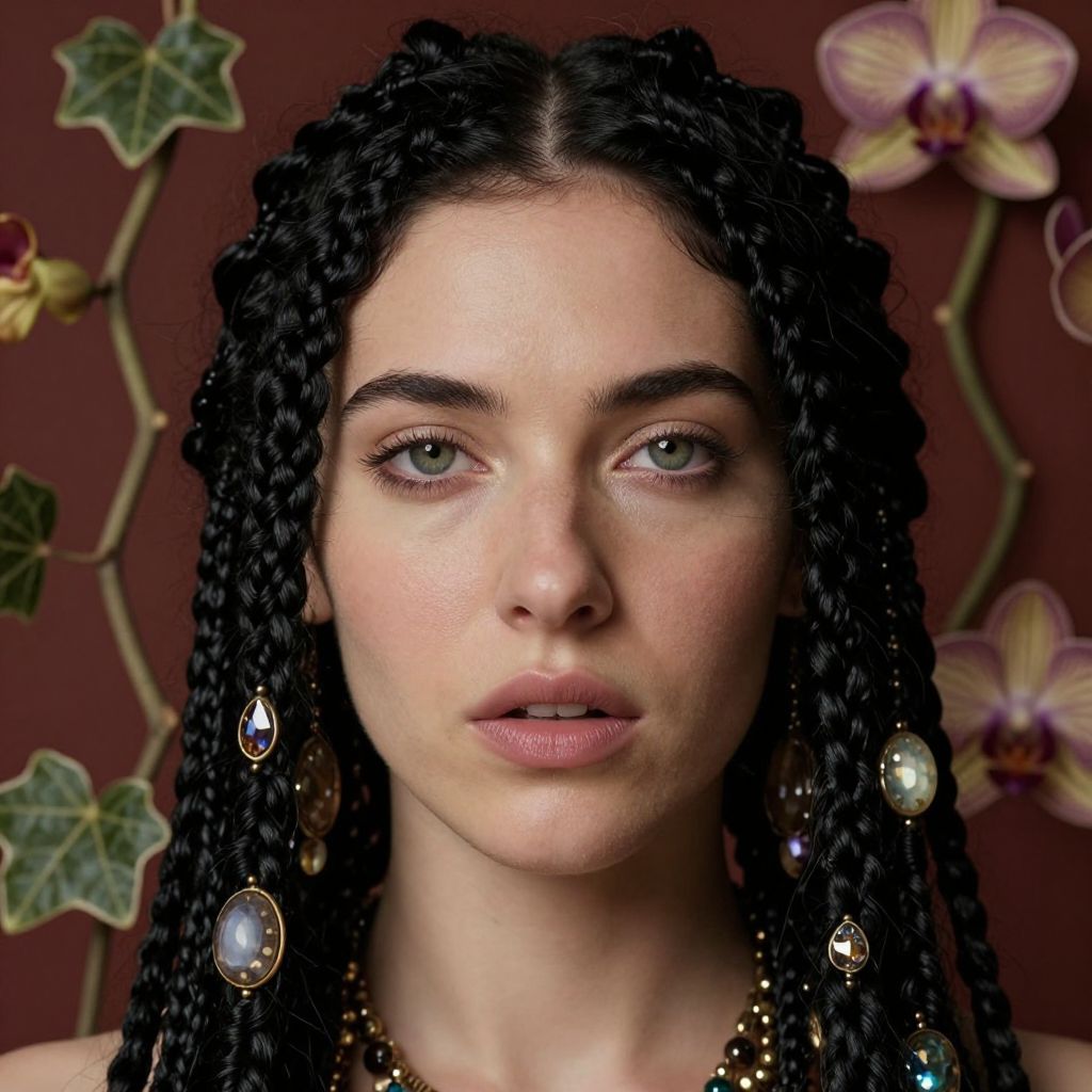 Photograph of a young woman with fair skin and green eyes, centered in the frame. She has long, thick, black braided hair adorned with large, iridescent crystal earrings. Her eyebrows are dark and well-groomed, and she wears subtle makeup with a natural look. Her lips are slightly parted. She wears a gold necklace with small beads. The background features a deep red wall with green ivy leaves and purple orchids, adding a touch of nature to the composition. The image has a soft, slightly surreal quality, with a focus on the woman's calm, composed expression.