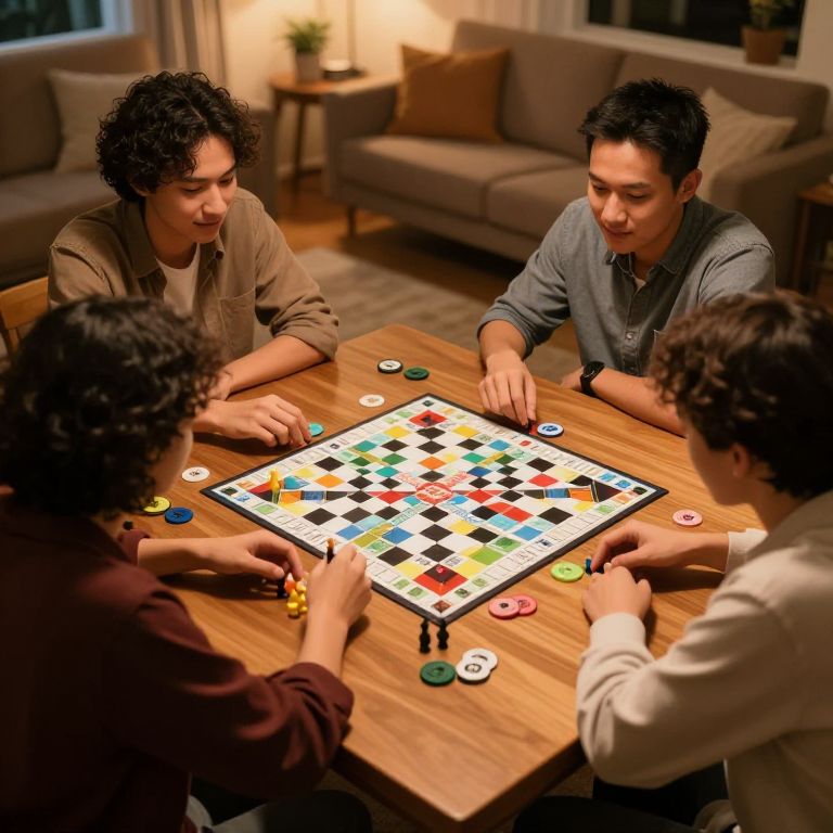 A group of friends gathered around a wooden table, playing a classic leisure board game like Chess or Scrabble, with pieces and tokens spread out, warm lighting creating a cozy atmosphere in a living room setting.