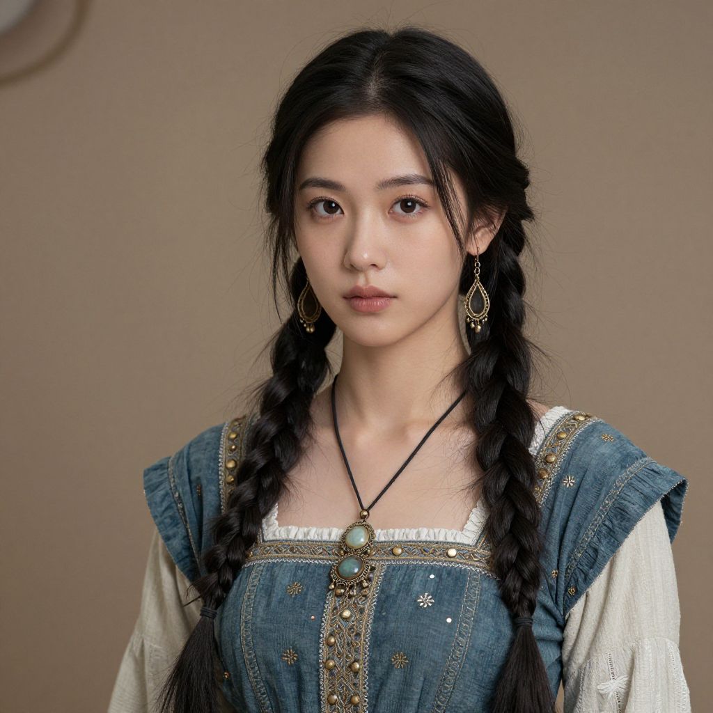 Photograph of an East Asian woman with long black braids, wearing a red traditional dress with blue embroidery and white silver jewelry, standing outdoors with a