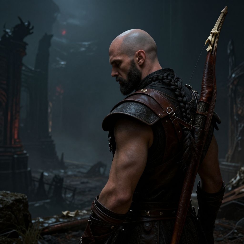 Photorealistic digital art of a muscular, bald, bearded man with a dark complexion, wearing dark leather armor with intricate straps and a long, sheathed sword on his back. He stands in a ruined, dark, dystopian landscape with crumbling stone structures and misty, eerie lighting. His profile is turned to the right, showcasing his defined arm muscles and serious expression. The background is shadowy, with hints of red and black, adding to the ominous atmosphere. The image has a high contrast, dramatic lighting style.