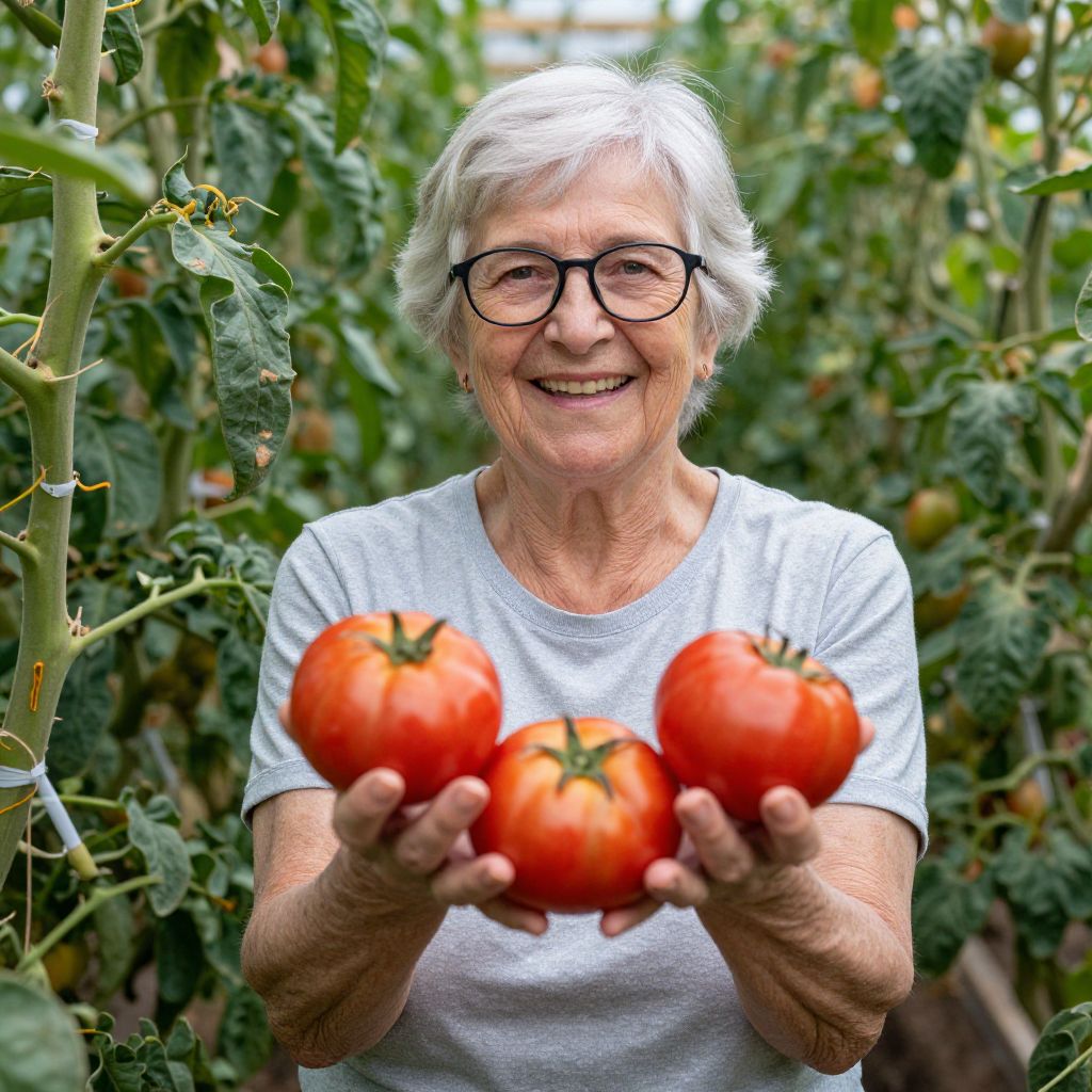 Photograph of a smiling, brown-haired woman in a white tank top, holding green crates of tomatoes and zucchini at an outdoor farmers' market.