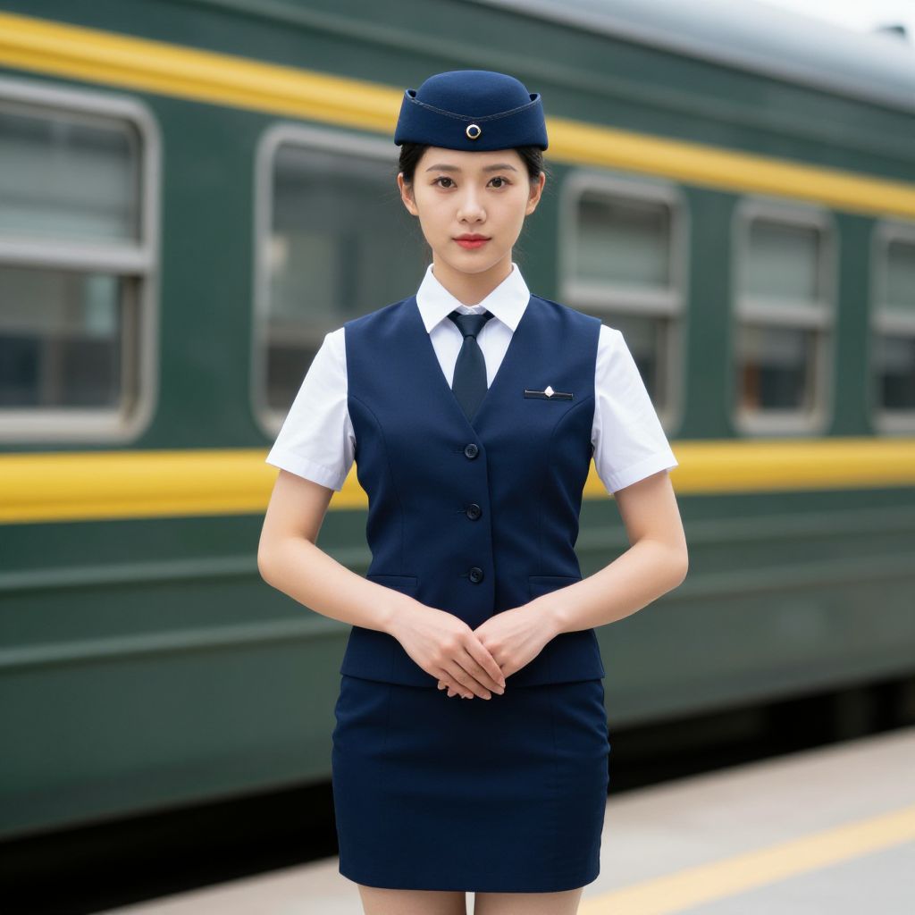 Photograph of an East Asian female train conductor standing on a platform. She has fair skin, short black hair, and wears a dark blue uniform vest over a white short-sleeved shirt with a black tie, paired with a matching dark blue cap. Her hands are gently clasped in front of her. In the background, there is a green train with a yellow stripe, slightly out of focus, indicating depth. The platform is clean and brightly lit. The conductor's expression is neutral, and she stands confidently, facing the camera.