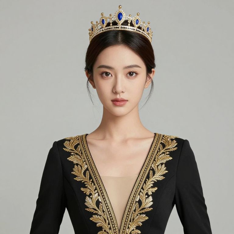 Female wearing a black dress with gold embroidery and a crown on her head.