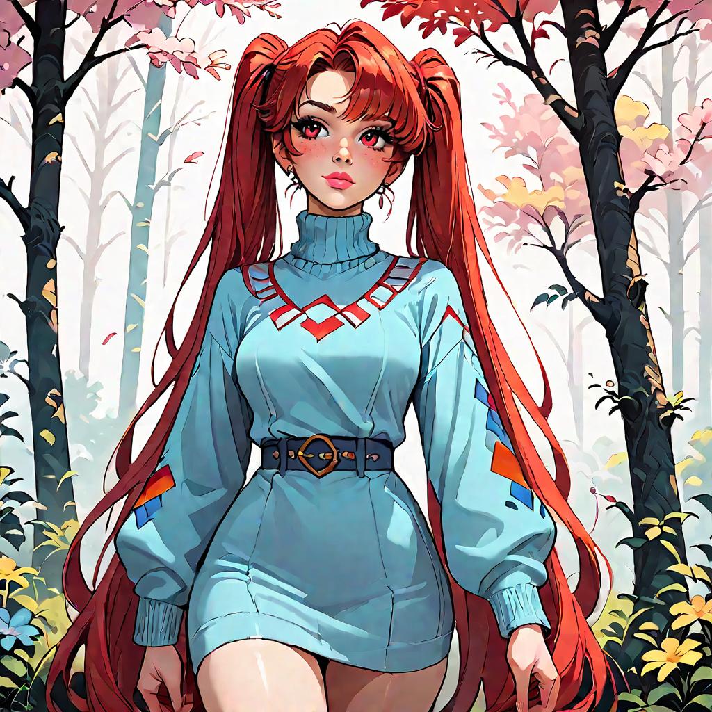 Score_9, score_8_up, score_7_up, source_anime 1girl, red hair, twin tails, turtleneck sweater, parted lips, yellow eyes, very long hair, standing, forest, outdoors, fantasy, leggings, sweater dress, wide hips