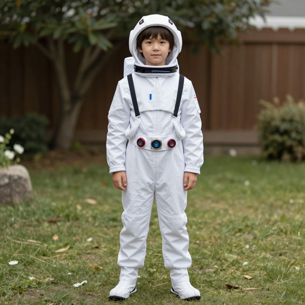Space Themed Costume Boy, boy in a white space suit standing in a yard