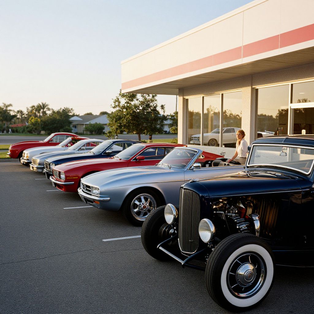Photograph of a vintage car lot at sunset, featuring a row of classic cars parked in front of a modern building with large glass windows and a red horizontal strip. The cars, from left to right, include a red sedan, white convertible, red convertible, silver convertible, and a black vintage convertible with whitewall tires and a chrome grille. A person in a white shirt stands near the silver convertible. The background shows green trees and a clear sky. The lighting casts long shadows, highlighting the cars' glossy finishes.