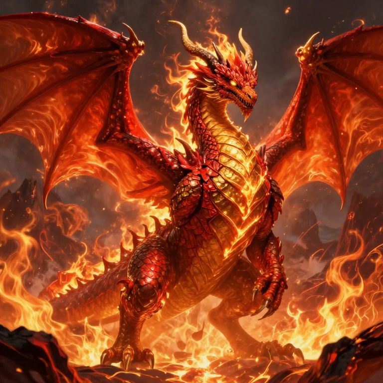 Digital illustration of a fiery red and yellow dragon with large wings, standing in a blazing volcanic landscape, surrounded by intense flames.