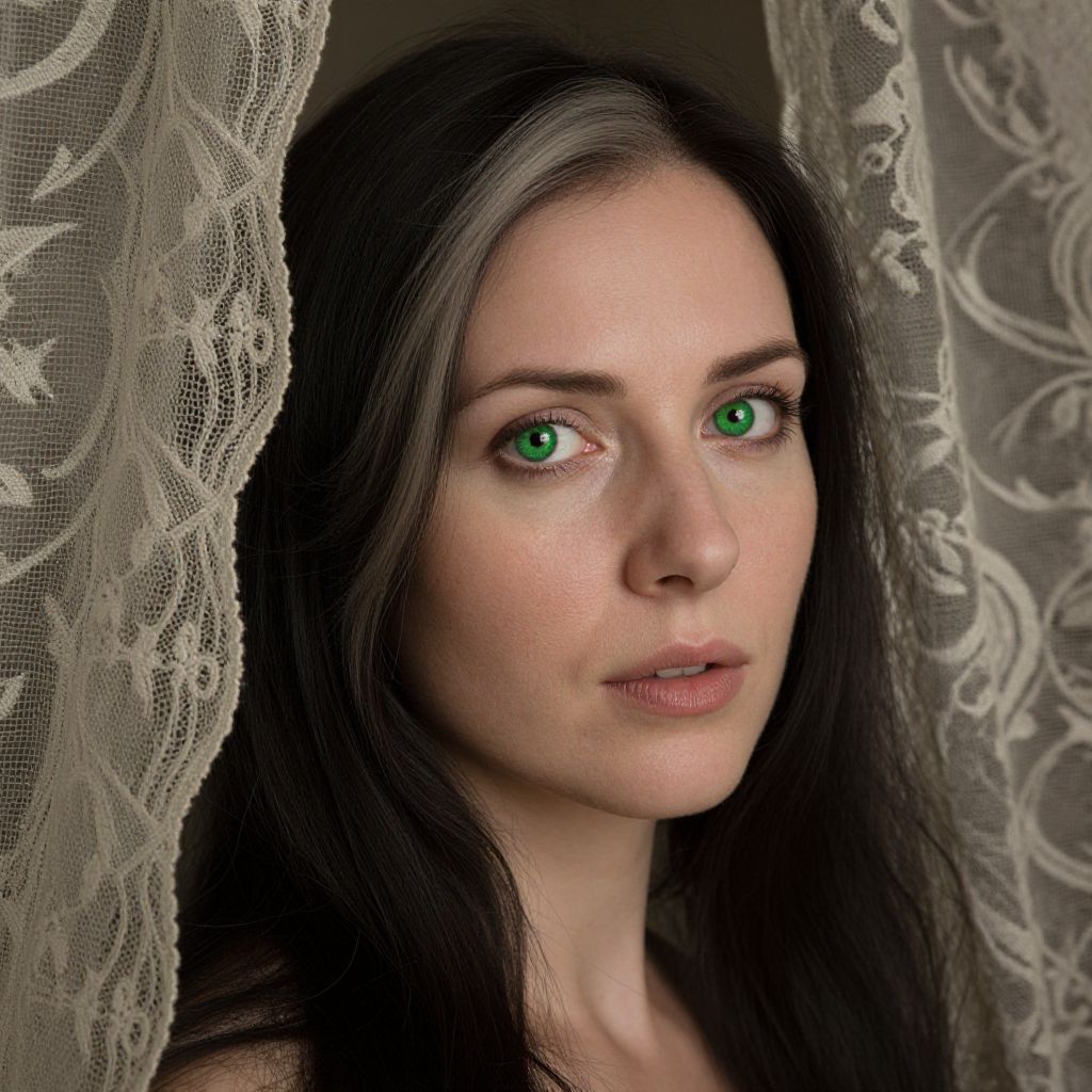 A photorealistic portrait showcases an Easter European woman's captivating gaze with striking green eyes and raven hair streaked by silver. Her thoughtful expression, framed by soft light filtering through antique lace curtains, illuminates her porcelain skin, revealing subtle imperfections that enhance her character's authenticity. The three-quarter view adds to the mystery, while a faint sepia tint evokes nostalgia, timelessness, and hyperrealistic detail in this alluring and captivating portrait.