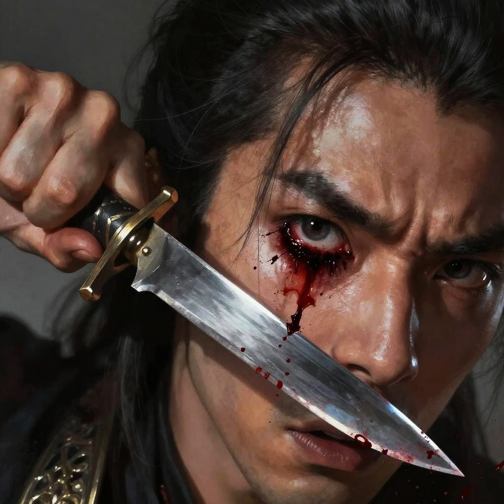 Stabbed in eye with knife scene, a fantasy warrior in battle, vivid blood splatter, dynamic motion, sharp knife crystal blade, epic dramatic atmosphere, painted in digital art style