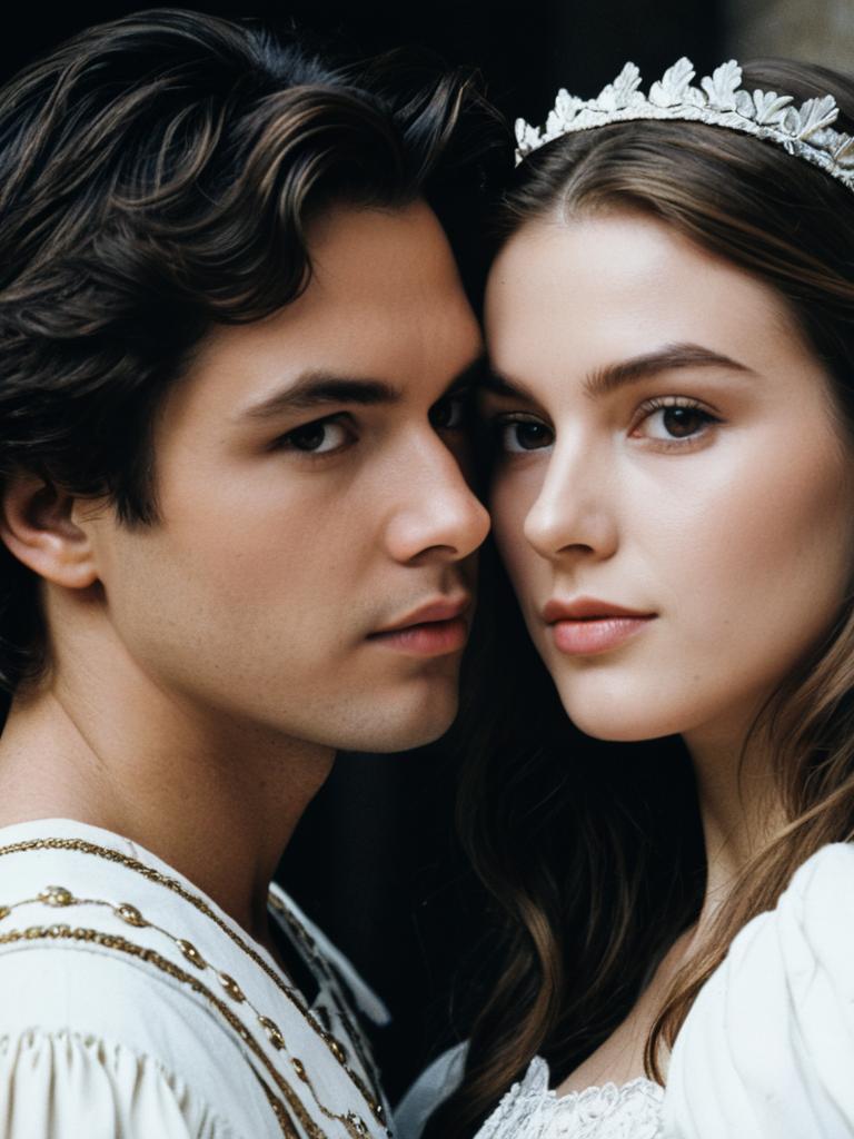 Couple in Romeo and Juliet Angel Costumes, close-up detailed headshot, romantic realism