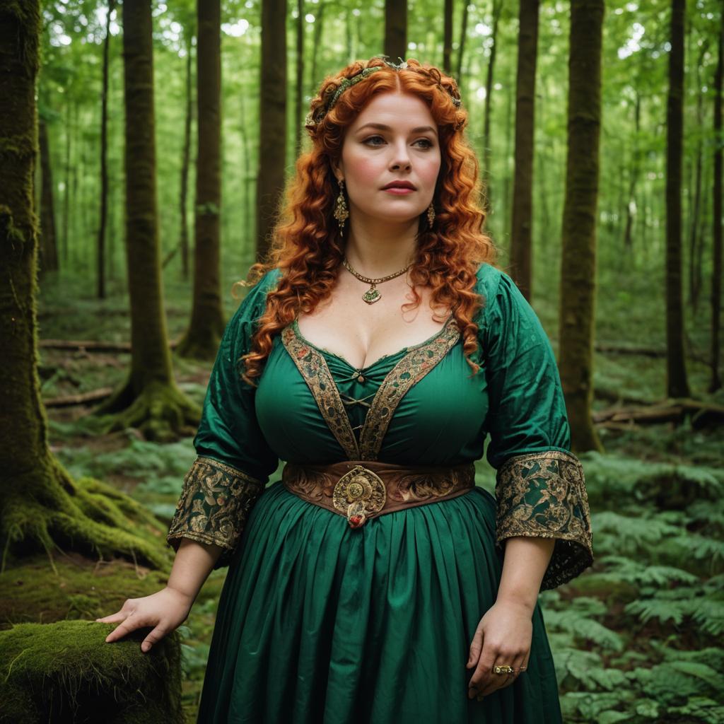 Portrait of a curvy woman with curly red hair wearing an ancient-style green dress with puffed sleeves, posing confidently in a lush green forest setting. The woman has fair skin and wears detailed earrings, standing among tall trees and ferns.