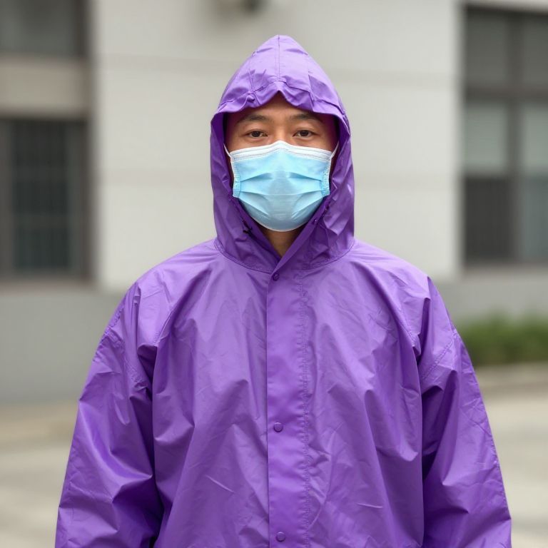 A person is wearing a purple raincoat with a mask on their face. The person is standing in front of a building.