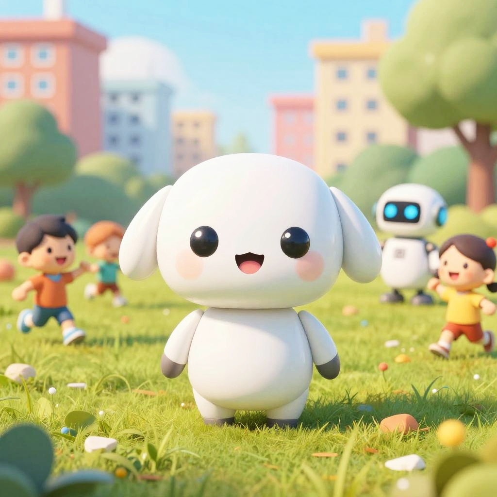 Cartoon AI free illustration, a playful AI companion portrayed as a small robot pet with smooth curves and bright eyes, set in a colorful urban park with children playing and robots assisting, cheerful and heartwarming scene