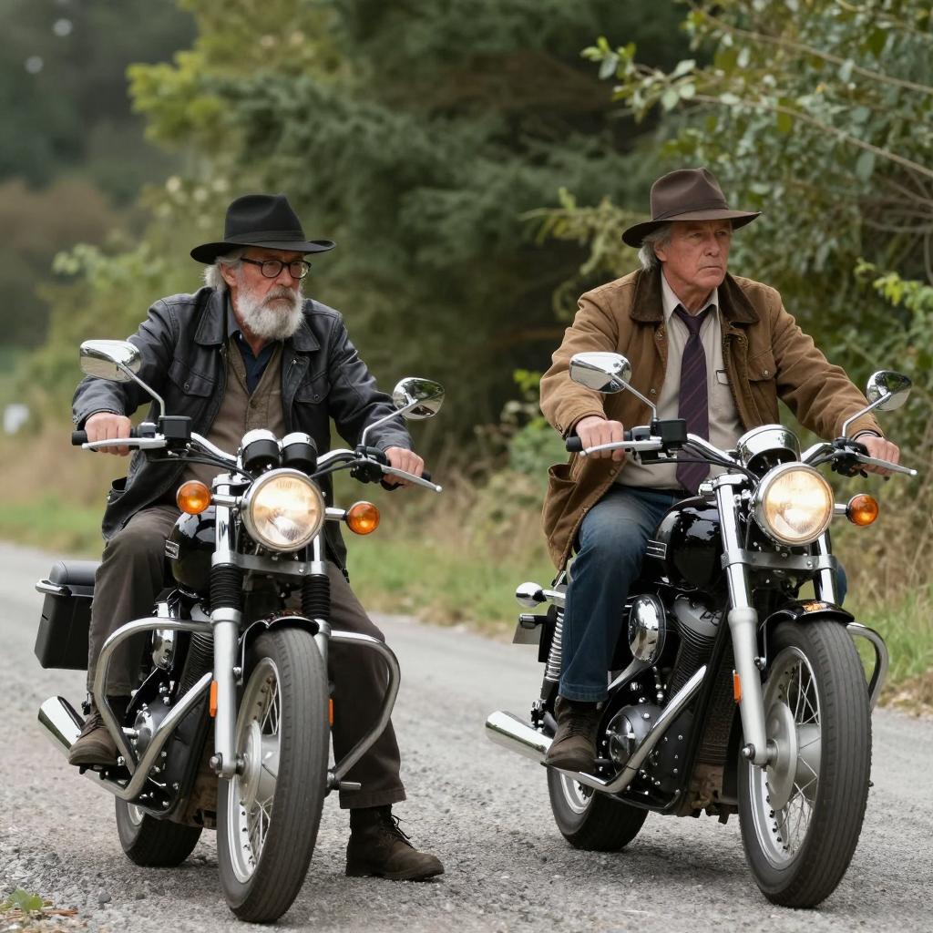 Two men in 1920s attire, outdoors. Older man with gray beard, black hat, brown suit, white shirt, leaning on motorcycle handlebars, smiling. Younger man, brown hat, brown suit, black tie, riding motorcycle, looking at older man. Green trees, blue sky, mountain in background. Motorcycle in foreground. Both men wearing glasses. Older man's left arm resting on handlebars. Younger man's right arm on motorcycle grip.