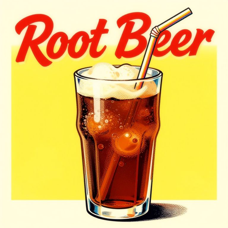 How to draw root beer in a retro style advertisement poster, showing a tall glass with effervescent bubbles, a colorful straw, and stylized typography, evoking 1950s Americana vibes with bright, contrasting colors and halftone shading effects.